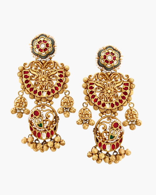 This celebratory piece is laced with an enticing alliance of 18 karat Gold, diamond, colour stones and enamel. The luxurious artistic ensemble is an ode to Mahishasurmardini– the divine Mother who slays the evil and nurtures the good.